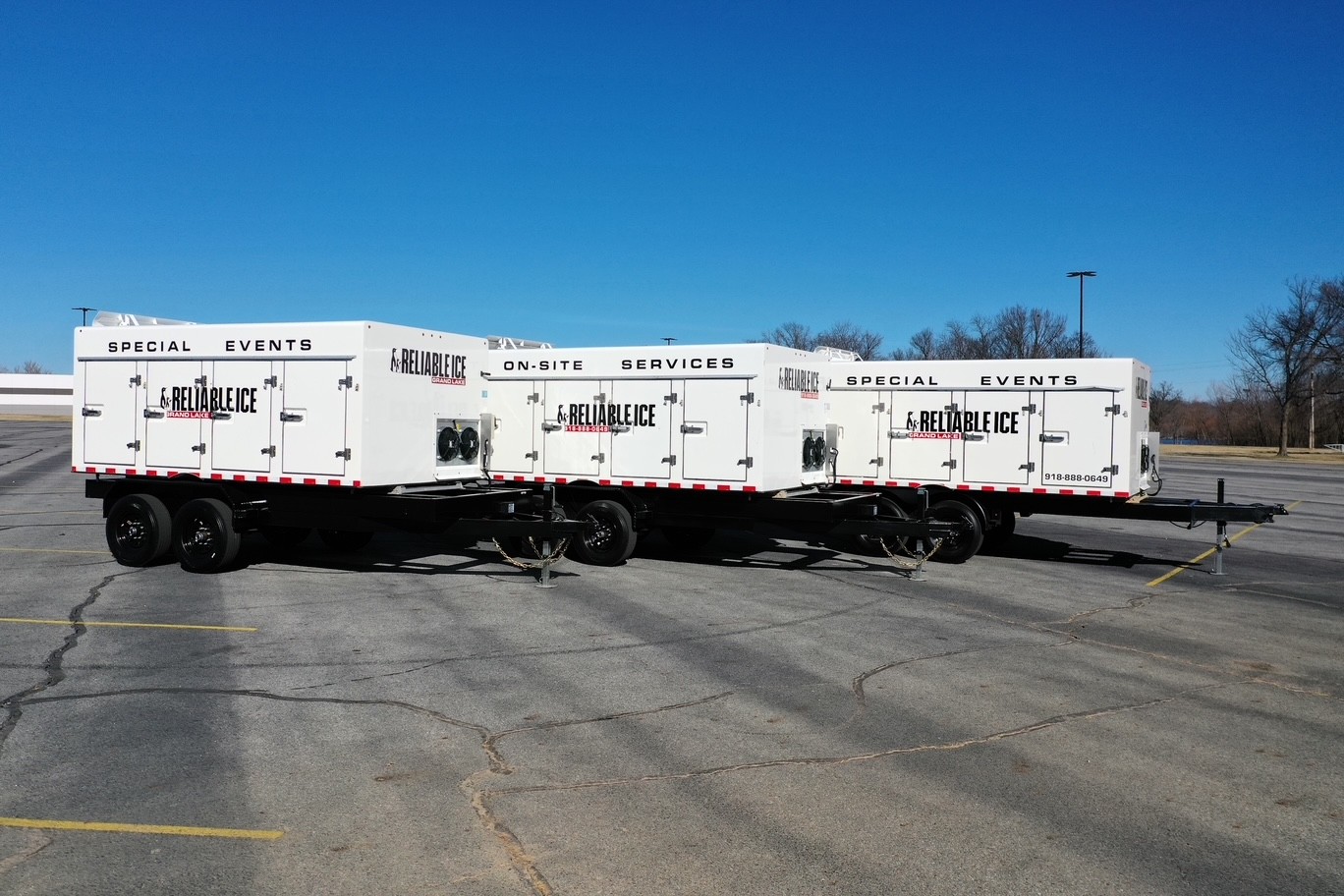 Each trailer can store up to 7,000 lbs of ice and requires no power for up to 72 hours once on site, thanks to our advanced cold plate system. That means no loud refrigeration units and no concerns about on-site power availability. Your ice stays frozen for days, without power, and ready whenever you need it.